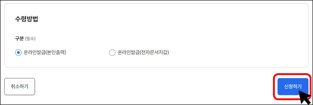 다. '온라인발급(본인출력)'을 선택하고 <신청하기> 버튼을 클릭하면 신청 완료입니다.