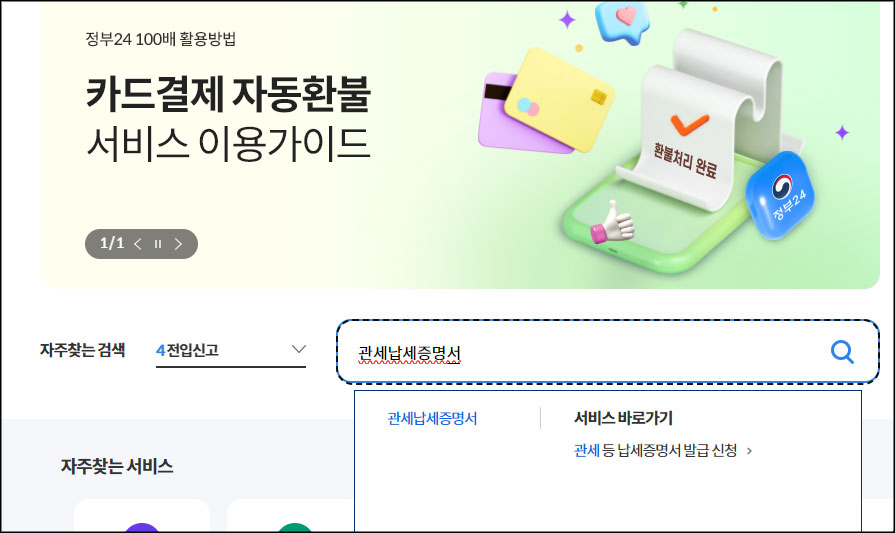 가. 검색창에 '관세납세증명서'를 입력하면 바로 아래에 서비스바로가기가 생성됩니다.