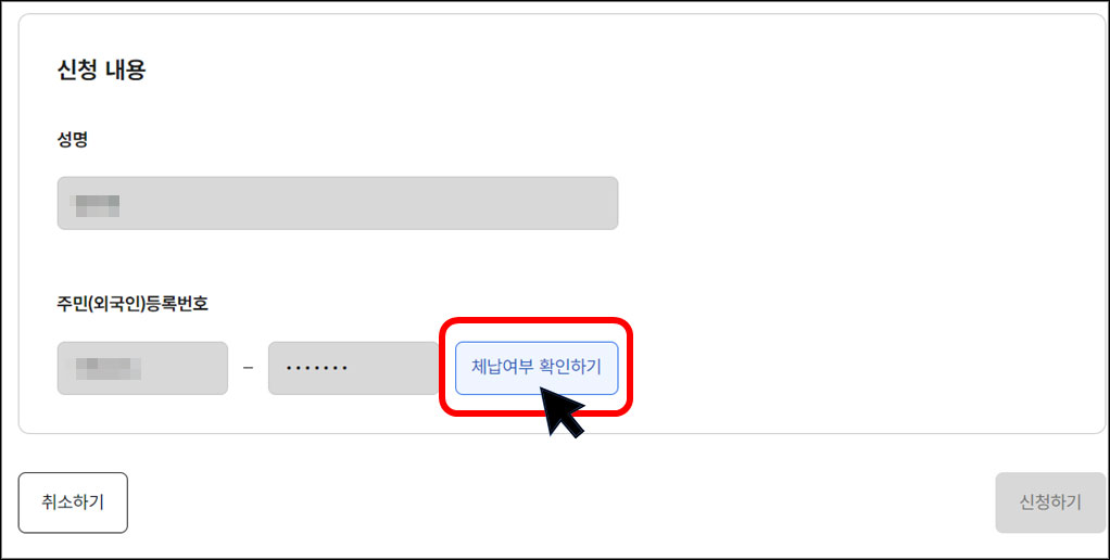 가. 신청인의 이름과 주민번호를 입력한 후, <체납여부 확인> 버튼을 클릭합니다.