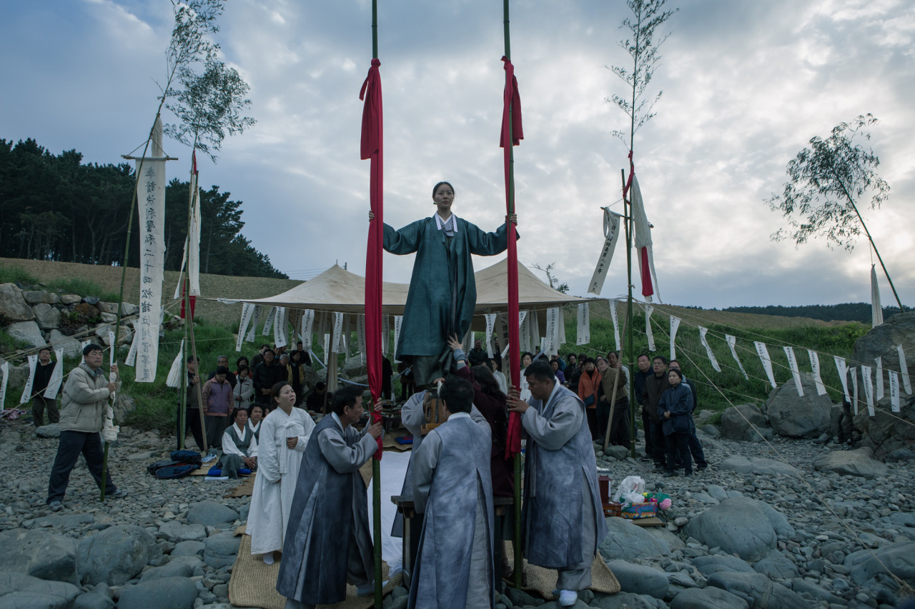 실제로 영화 초반부에 이 천도재를 지내는 장면이 몹시 흥미진진하게 나옵니다. 죽은 영혼을 위로하기 위해 '넋건지기굿'을 엽니다. 넋건지기굿이란 영혼이 저승 갈 때 배불리 먹고 떠나라고 붉은 천에 밥이 한가득 담긴 놋그릇을 바다를 향해 던지는 의식입니다.