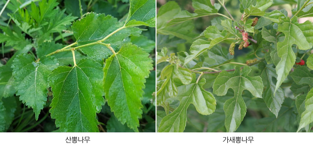 뽕잎은 잎모양이 둥근 산뽕나무와 잎 끝이 갈라진 가새뽕나무가 있습니다. 어떤 사람은 산뽕나무가 효능이 더 좋다고는 합니다만 단점이 새순이라도 산뽕나무잎이 좀 더 억새 축에 듭니다. 제 생각으로는 가새뽕나무잎이 조금 더 연한 것 같습니다. 효능도 큰 차이는 없을 듯합니다. 워낙 생장속도가 빠르고 아무 곳에서나 잘 자라기 때문에 마당에 작은 한그루만 심어도 그 이듬해부터 뽕잎을 실컷 따 먹을 수 있을 정도입니다. 건강한 뽕잎 올봄에 많이 드시고 건강하세요.