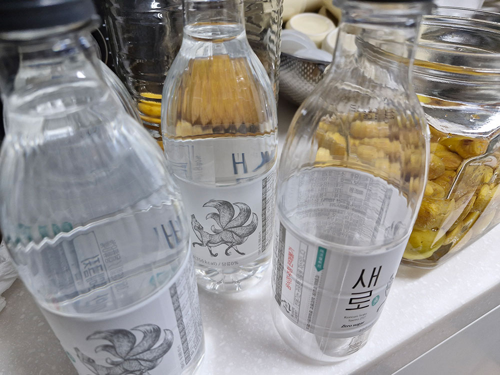 제가 평소에 즐겨마시고 있는 브랜드의 소주를 준비했습니다. 유리병은 미리 소독해서 말려두었어요.