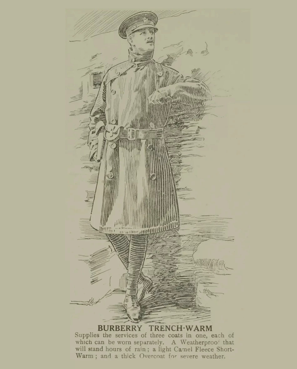 당시 영국사람들이 입고 다니던 레인코트는 주로 방수의 목적이었기 때문에 무거웠습니다. 1914년 제1차세계대전 발발 당시 버버리는 군인을 위한 트렌치코트를 발명합니다. 이 코트는 방수가 잘 되면서도 가볍고 오래 입을 수 있는 내구성에 초점을 맞추었습니다. 장갑과 호루라기 등의 군용 장비를 걸 수 있게 견장을 붙였고 수류탄을 휴대할 수 있는 D랩, 스톰 플랩(Storm Flap)을 달고, 손목에 조임 장치를 추가해 비바람을 막아주도록 했습니다. 이 트렌치코트는 디자인적 특징과 기능성으로 인정받으며 군에 50만 벌에 달하는 수량을 납품하게 됩니다. 이 레인코트는 훗날 <참호>라는 이름이 붙으며 전 세계적으로 트렌치코트의 대명사로 자리매김하게 되었습니다.