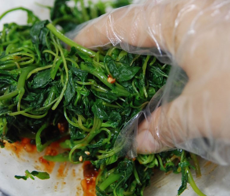 비름나물의 굵은 줄기는 버리고 어린잎 위주로 다듬어 끓는 물에 빠르게 데쳐냅니다. 곧바로 찬물에 담가 푸릇한 나물 색이 살아나도록 합니다. 무침요리에 쓸 때는 물기를 꽉 짜서 사용하며, 시금치나물 무치듯 가볍게 털어가며 무쳐야 잎이 물러지지 않게 무칠 수 있습니다.