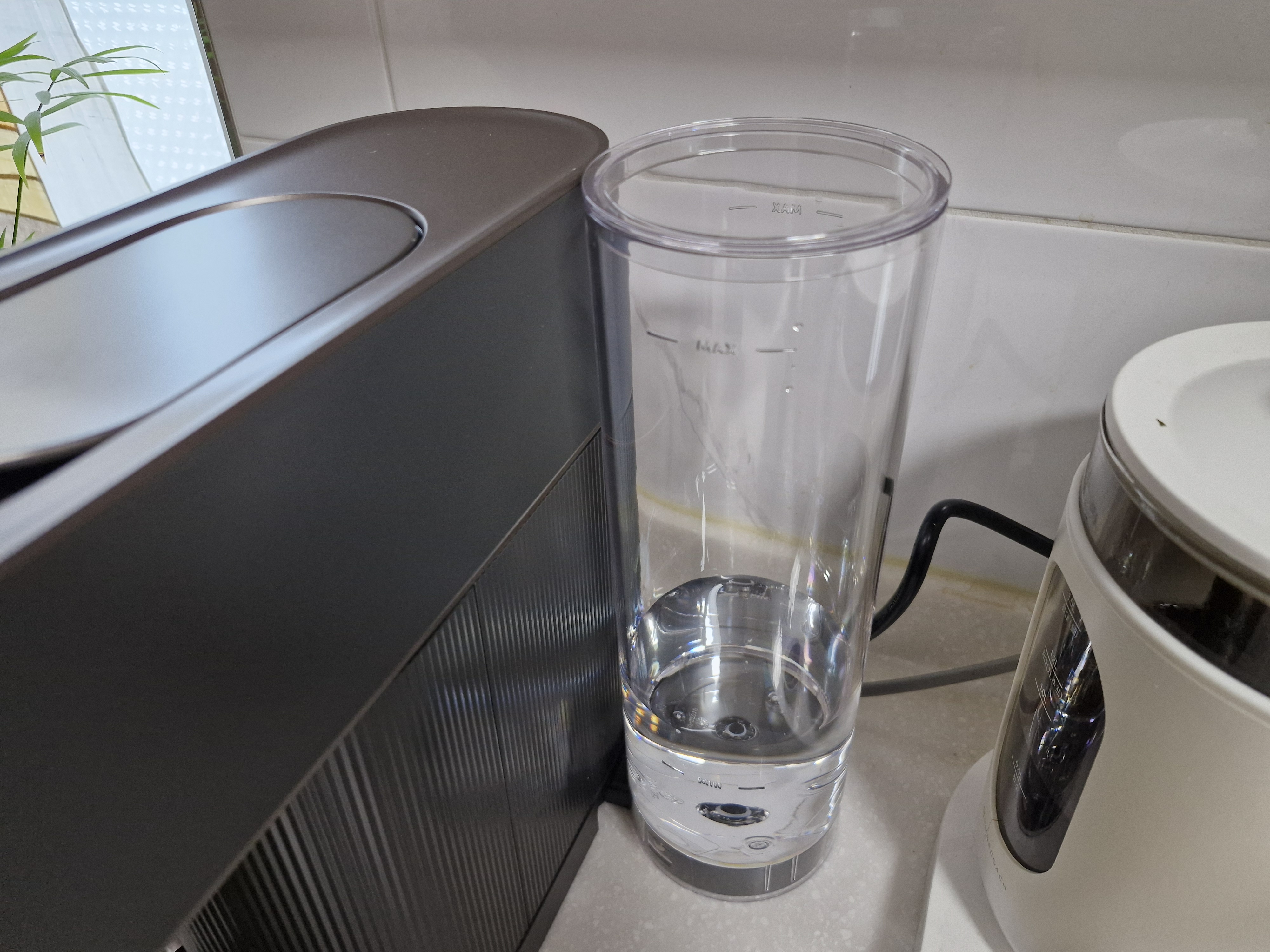 우선 타 브랜드의 머신과 비교했을 때 미니 사이즈 제품을 제외하고 크기는 거의 비슷합니다. 2024 브랜드 어워드상을 받은 제품이라고 합니다. 세계적인 디자이너 벤자민휴버트의 디자인으로 외관이 엄청 심플하면서도 플라스틱 재질이 대부분 싸구려처럼 보이는 것에 비해 좀 더 고급스러운 느낌입니다. 아마도 골지패턴과 금박테두리를 두른 효과 때문이 아닐까 생각됩니다. 컵 트레이스도 없는 것보단 설치하고 쓰는 것이 훨씬 더 고급스럽습니다.