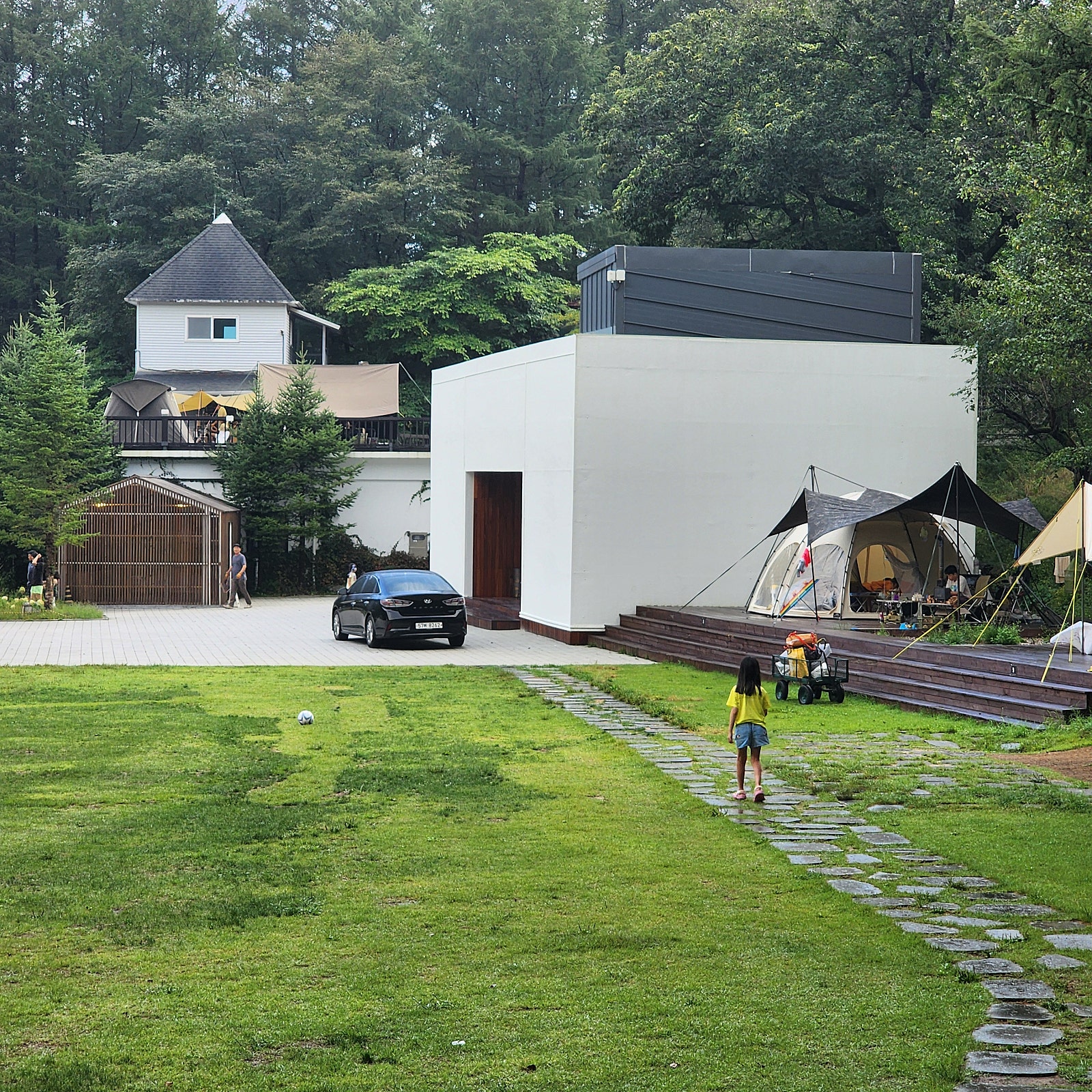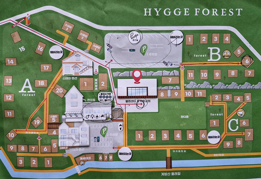 소나무와 잣나무 숲 속에 적당한 거리를 두고 데크가 자리한 이 곳은 캠퍼들의 목적 자체가 조용히 쉬는 것이다 보니 말소리도 소곤소곤, 음악소리 하나 들리지 않는 소음 청정구역이었습니다. 사이트는 중앙에 난 좁은 차도를 따라 자동차가 진입할 수 있어 첫날과 마지막날 자신의 사이트 앞까지 짐을 실어 나를 수 있습니다. 휘게의 전제 존 모두 자동차는 공동주차장에 주차해야 합니다.