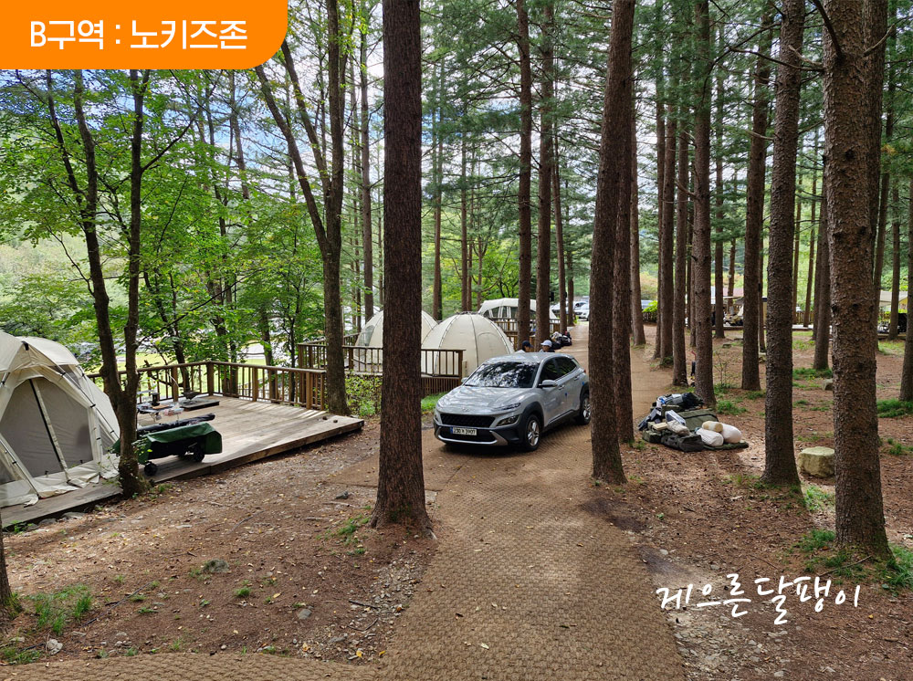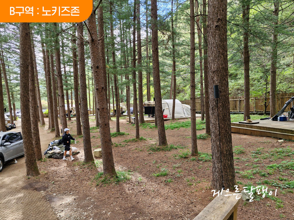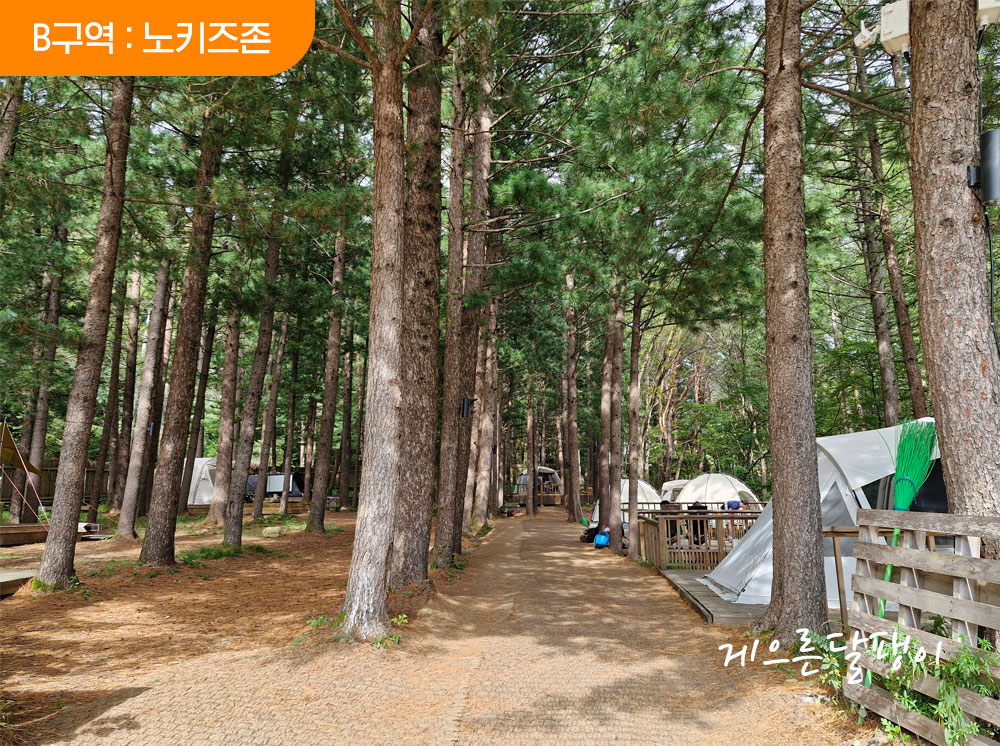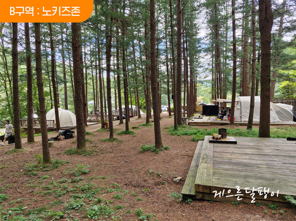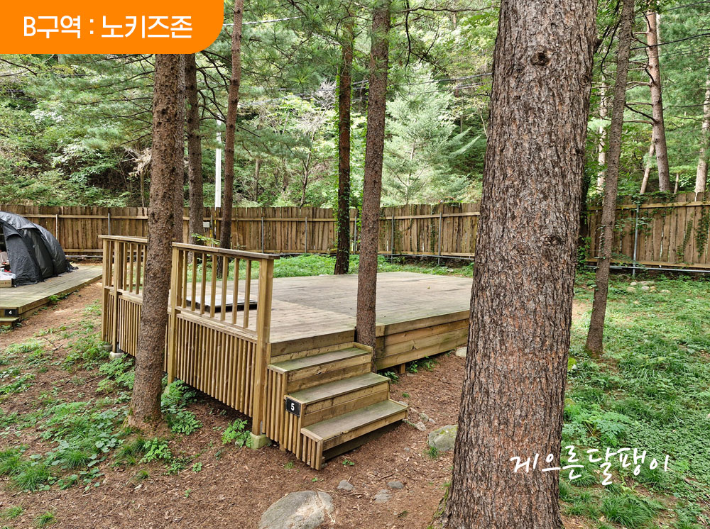 5개의 존 중 제일 넓은 장소에 마련된 존으로 소나무 숲속에 데크로 이루어진 사이트가 준비되어 있고 사이트 간 간격이 비교적 널찍한 편입니다. 명당데크가 따로 없을 정도로 모든 데크 다 좋습니다. 편의동과도 가까운 지점이라 더욱 편리합니다.