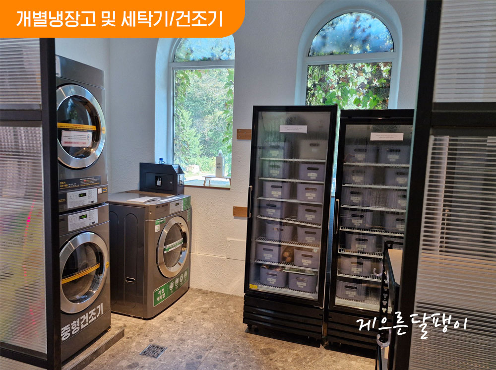 공용냉장고는 모든 사이트별로 개별 바구니가 준비되어 있는데 다만 그 크기가 그리 크지 않아 한 여름엔 부족할 듯하지만 꽤 요긴하게 쓰이고 있었습니다. 그리고 옆에 유료로 사용하는 세탁기와 건조기도 구비되어 있습니다. 또한 유료로 사용 가능한 의류관리기 스타일러도 있습니다.