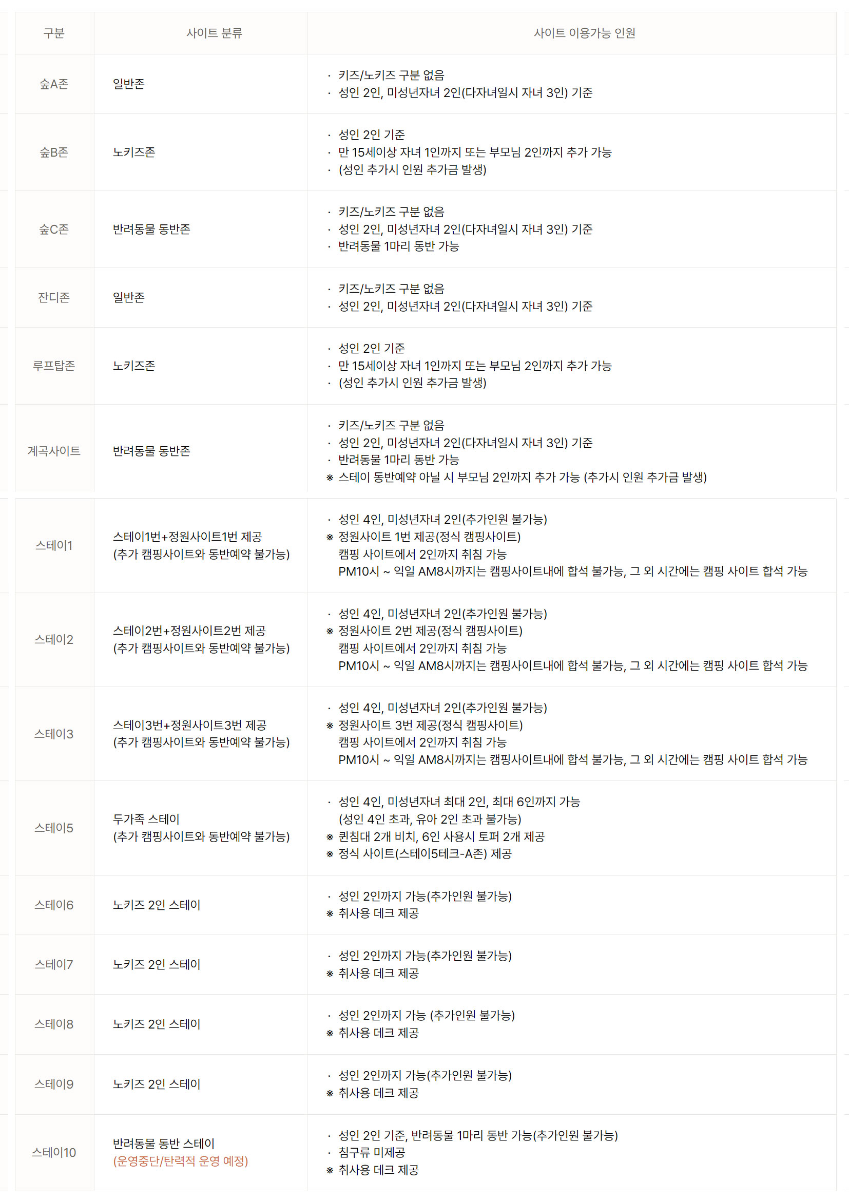 휘게 포레스트 캠핑장은 총 5개 구역으로 구분합니다. 숲 속존, 노키즈존, 애견동반존, 루프탑존, 스테이(펜션)로 나뉘어 있습니다.